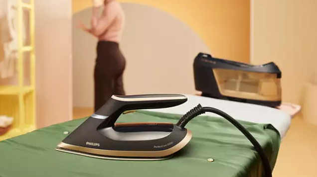 Seria PerfectCare 6000 w całkowicie nowej odsłonie charakteryzuje się niewielkimi wymiarami, a mimo to wytwarza wyjątkowo silny strumień pary, dzięki czemu prasuje wydajniej bez zajmowania dużej ilości miejsca.